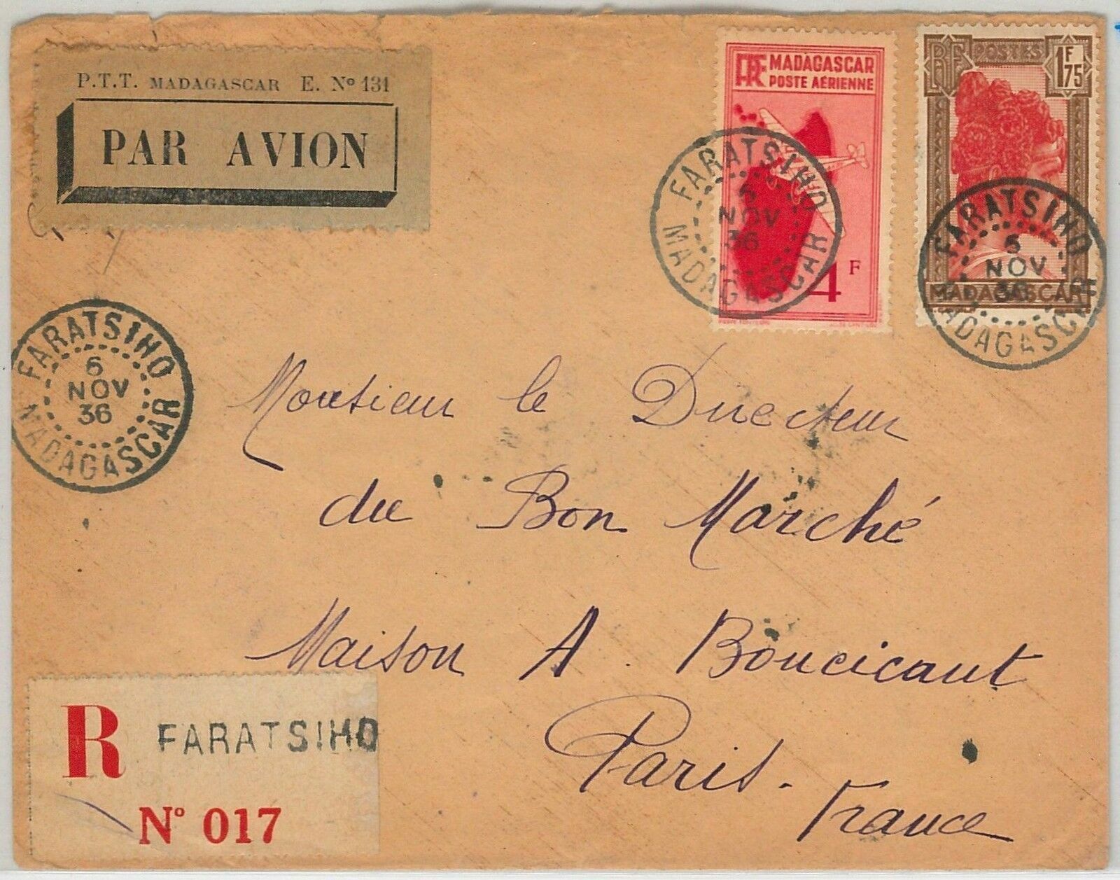44960 – MADAGASCAR – POSTAL HISTORY – REGISTERED COVER from FARATSHIO 1936