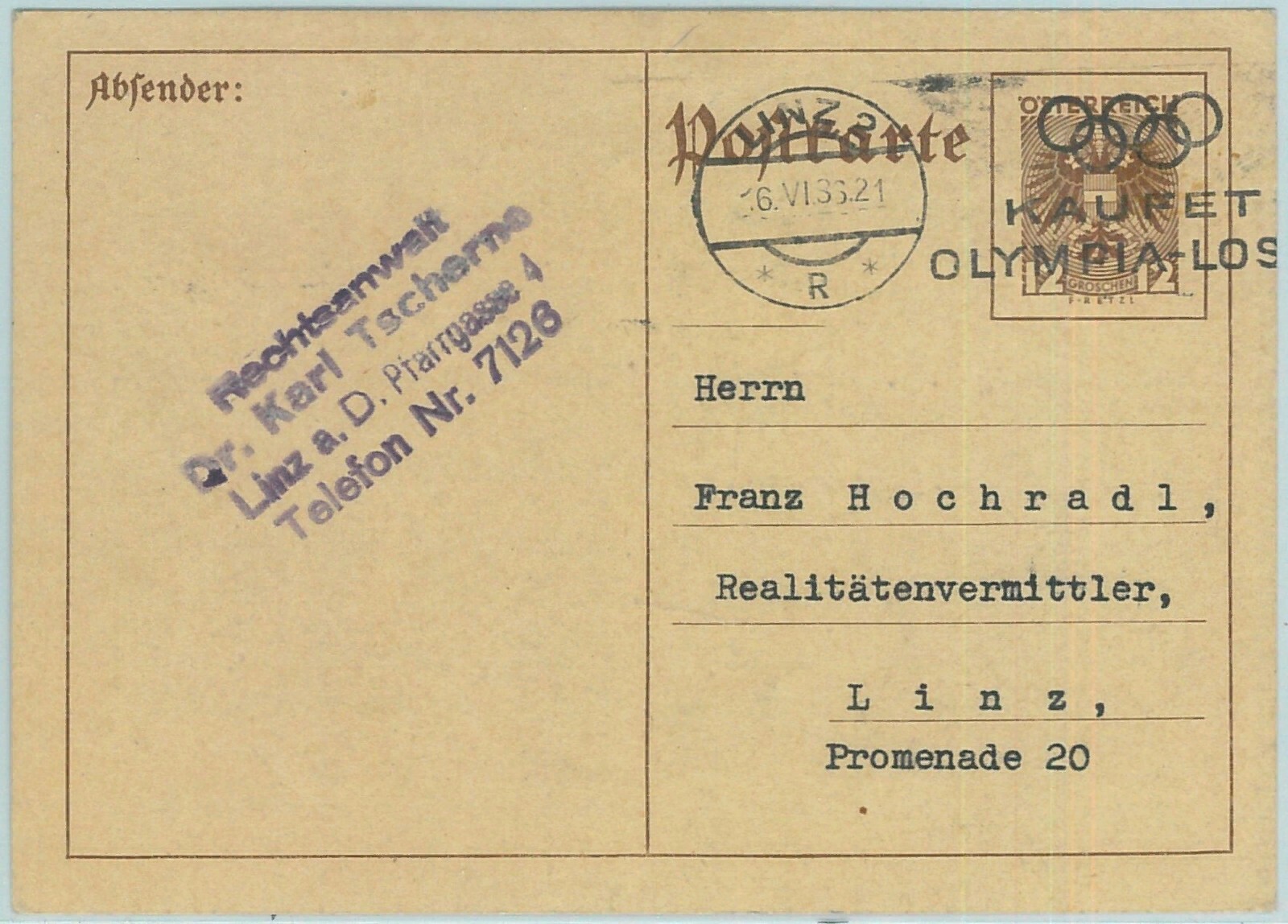 68102 – AUSTRIA – POSTAL STATIONERY CARD – 1936 Olympic postmark: LINZ 2