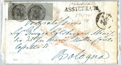 Oggetto: Sassone 7 coppia angolo di foglio su busta ASSICURATA da Macerata a Bologna. Bella!