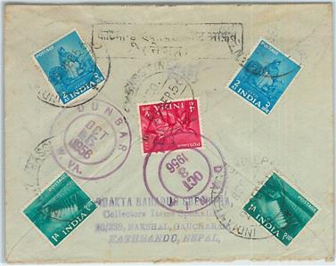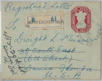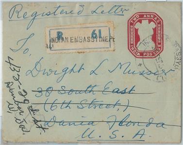 Item: Postal Stationery Cover sent registered with registration lable of the Indian Embassy in Nepal, to Dania (USA), redirected to Dunbar.