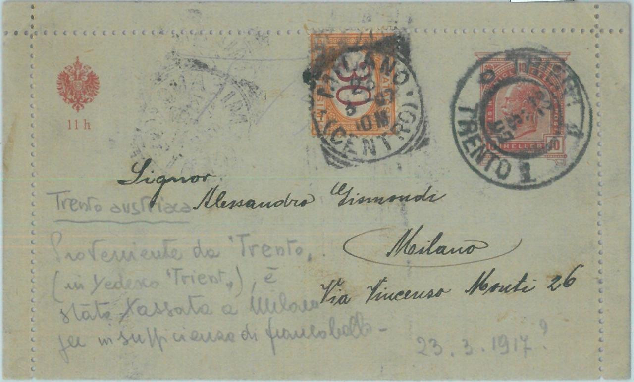 Item: Postal stationery letter card sent from Trient to Italy, taxed on arrival to Italy with segnatasse.