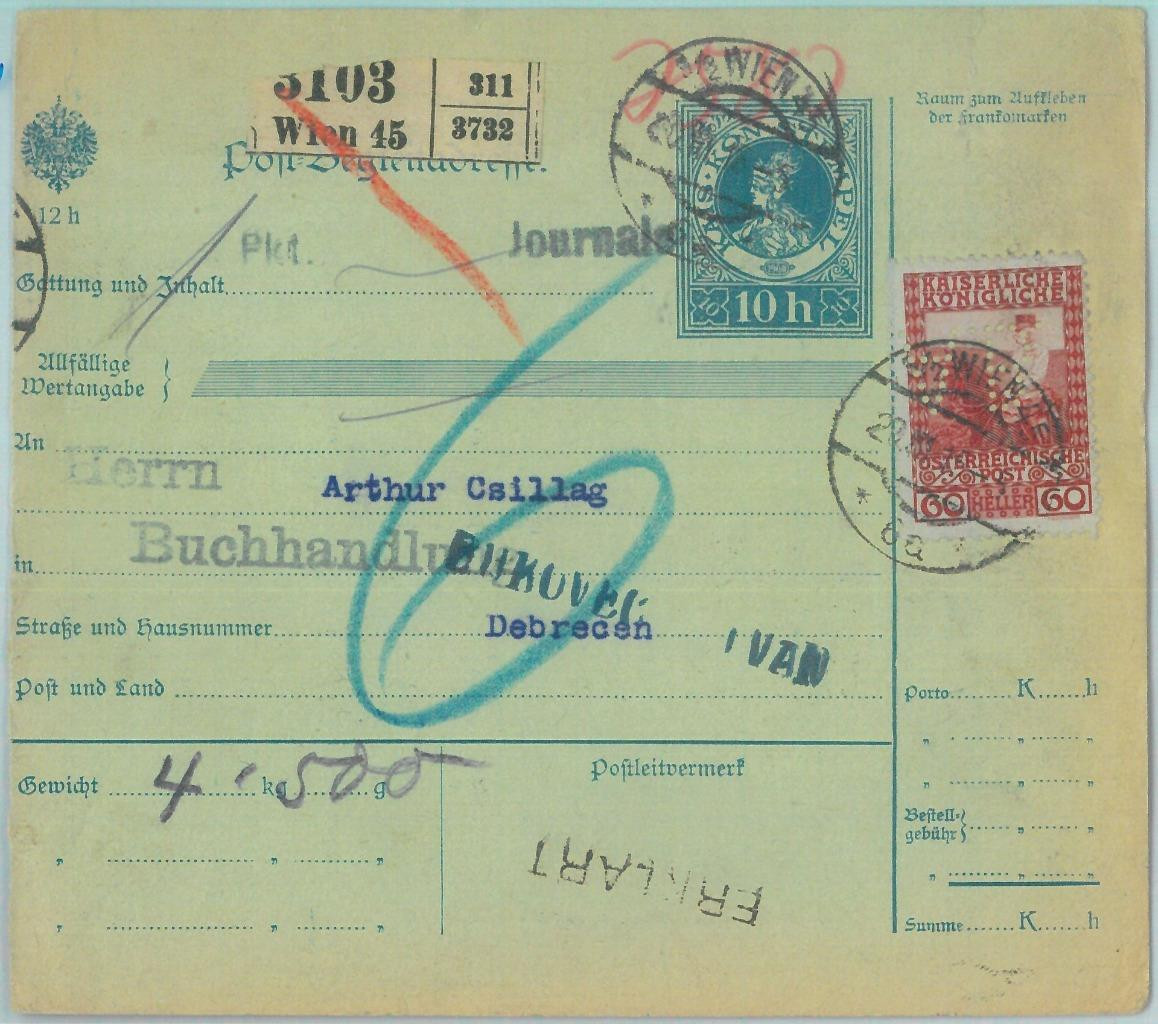 Item: Parcel stationery card with added stam with PERFIN perforation (A.B.)