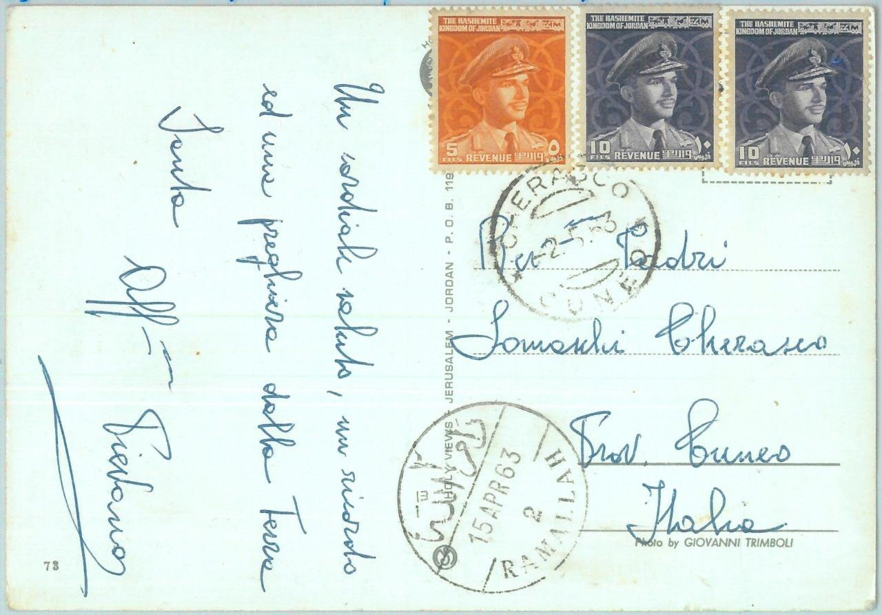 Item: Fiscal revenue stamps used as regular on postcard from Ramallah to Italy. Not taxed!