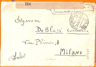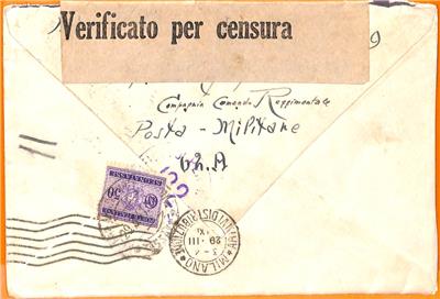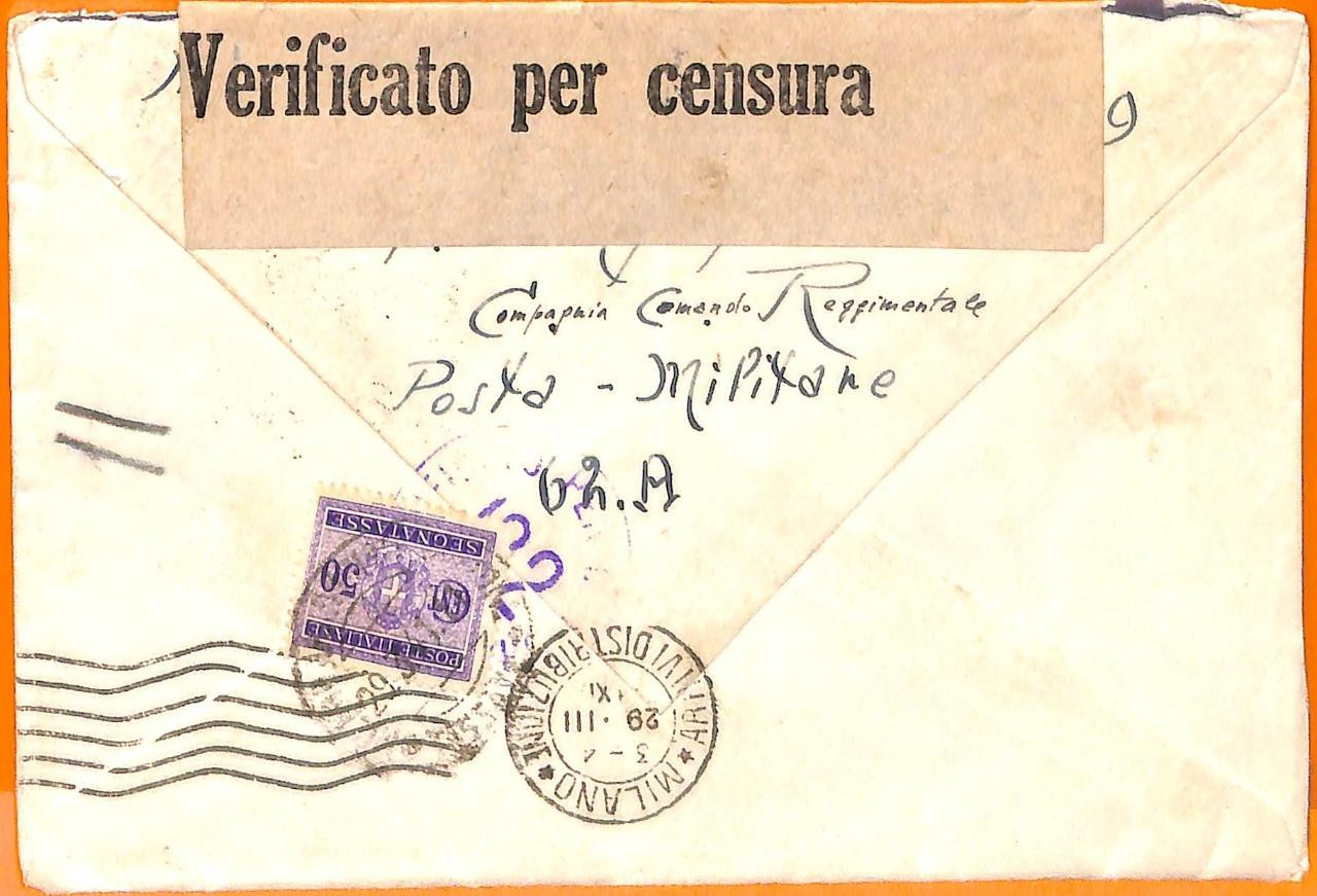 Item:  Cover to Italy, with Italian military postmark, censored and taxed on arrivale with a 50 cent segnatasse stamp.