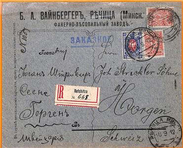 Item: Registered cover from Retchitza (Rechytsa, Belarus) to Switzerland