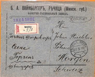Item: Registered cover from Retchitza (Rechytsa, Belarus) to Switzerland