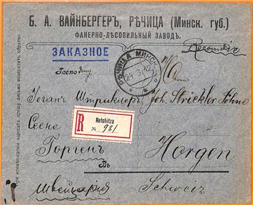Item: Registered cover from Retchitza (Rechytsa, Belarus) to Switzerland