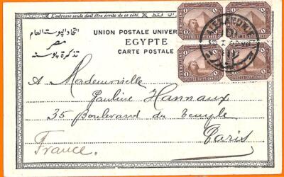Item: Postcard to France, with rae use of a block of 4 of the 1 mills stamp