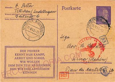Item: Postal Stationery Card from Decin to Italy. Censor postmark.