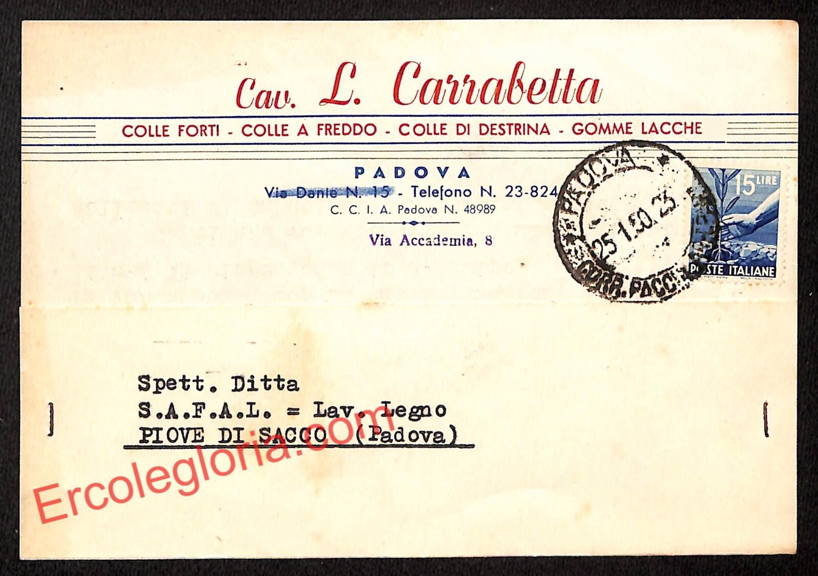 ah4383 – STORIA POSTALE – Padova Città – Cav. Luigi Carrabetta