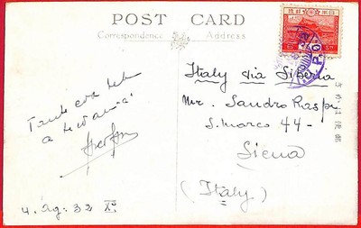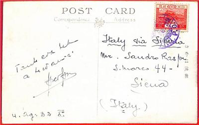 Item: Japanese stamp on postcard postmarked in the Japanese Post Office in Harbin , sent to Italy