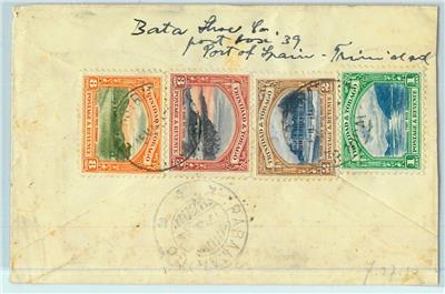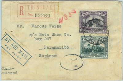 ItemFantastic franking on registered airmail cover to Surinam  –  Please note: left hand side cut.
