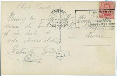 Item: Postcard with special postmark for the 1920 Olympic games