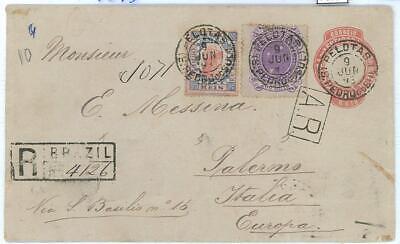 Item: Luxus piece, mixed franking, from Pelotas to Palermo 1893, 100 reis entire, with additional 2 stamps franking for to meet 1300 Reis rate. VERY ATRACTIVE!!