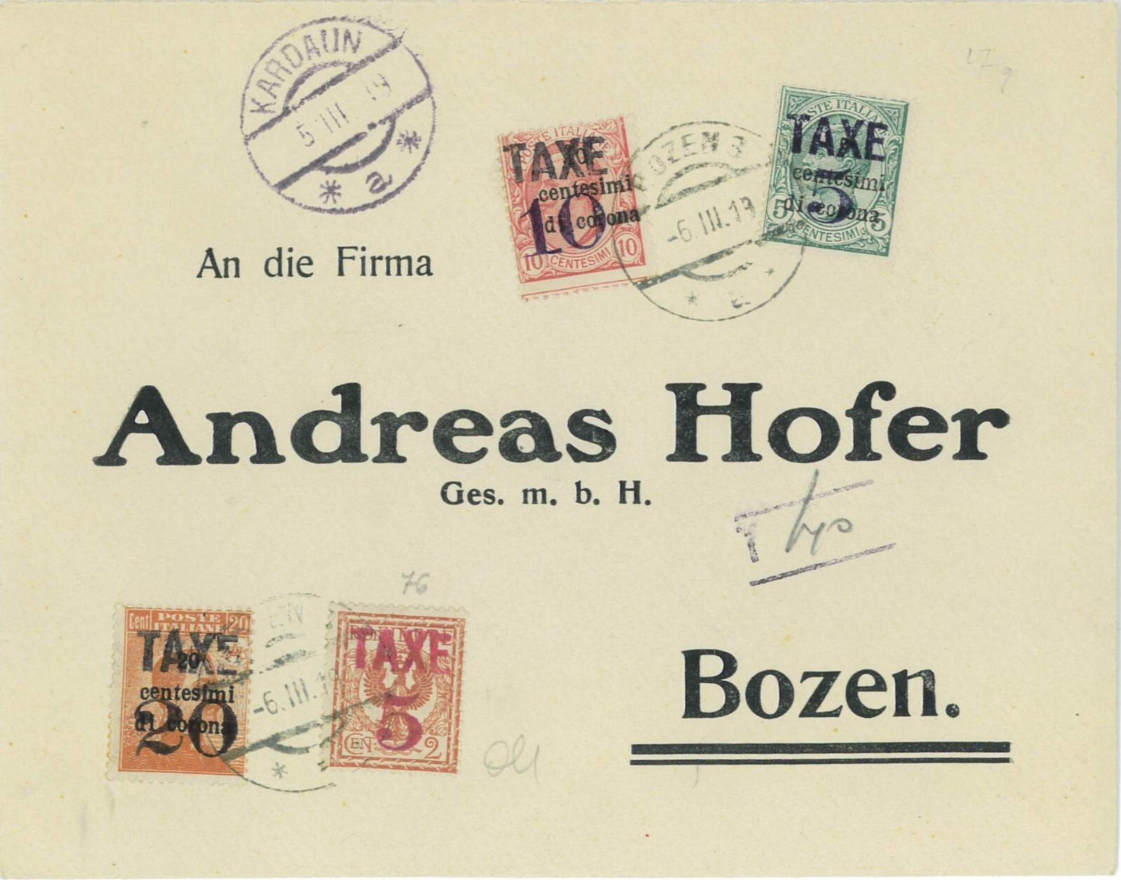 Oggetto: Busta da Kardaun, tassata in arrivo serie COMPLETA sassone BZ3 77/9. Filatelica ma BELLISSIMA!