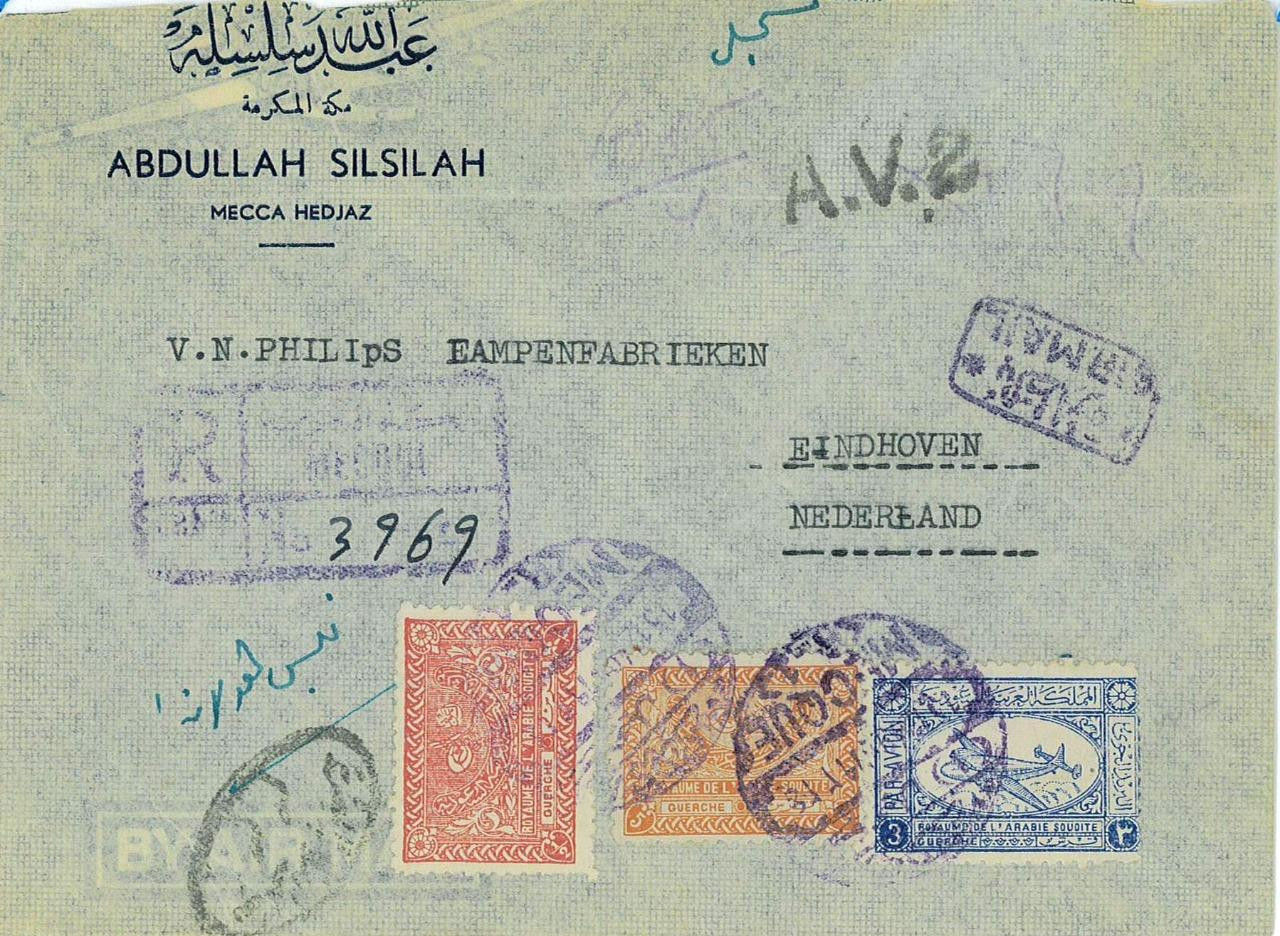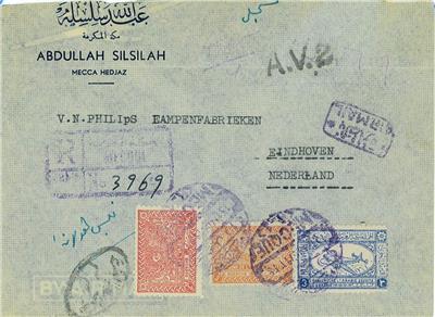 Item: Very nice cover, registered airmail, from Mecca to Eindhoven. Very rare!