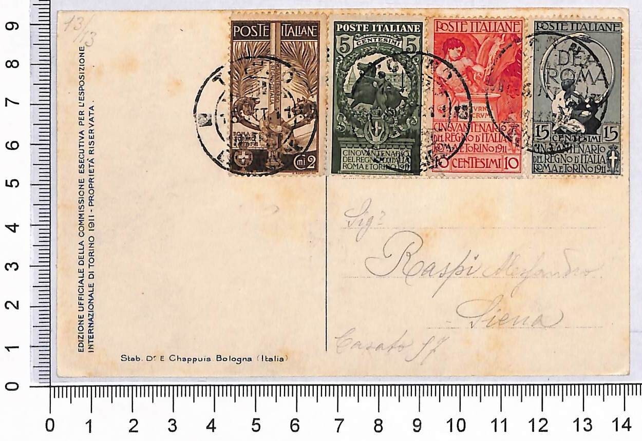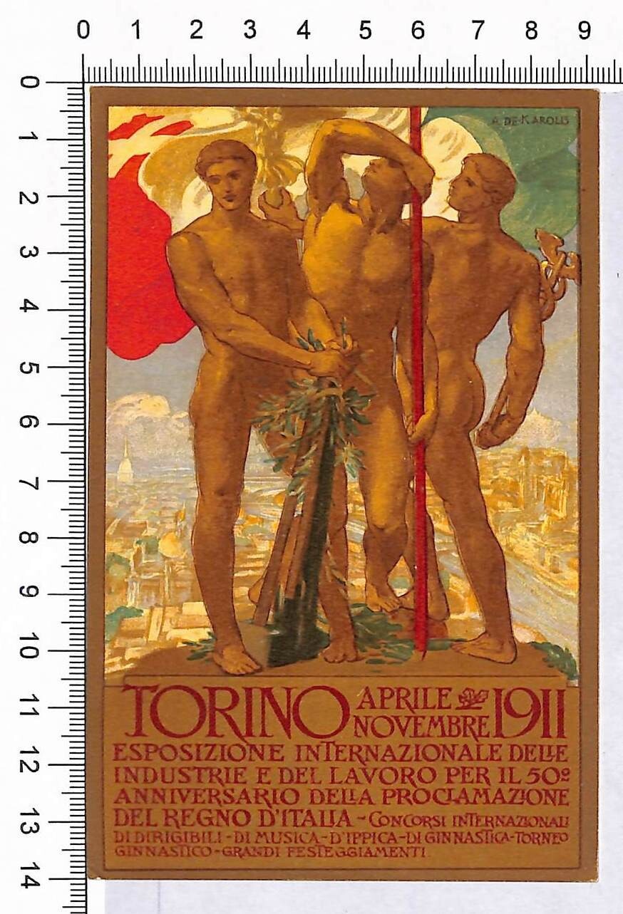 Oggetto: Sassone 92/95 usati su cartolina allegorica commemorativa di Torino, illustrata De Karolis.