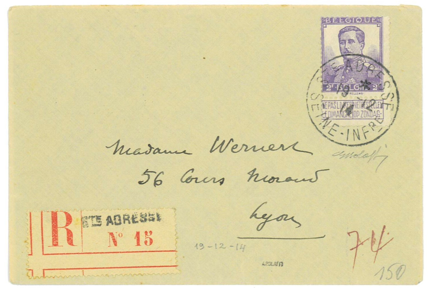 P2737 – BELGIUM 1914 LEOPOLD 2 FRANCS ON A REGISTERED SMALL COVER.